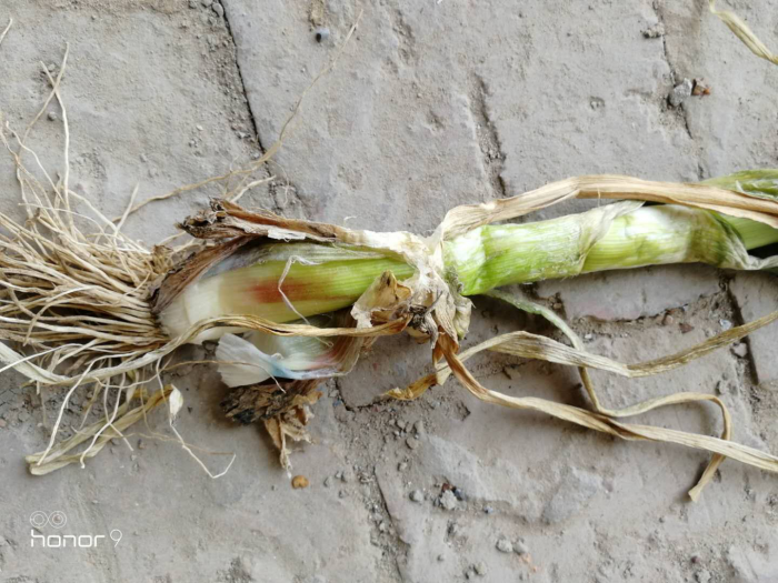 经过李教授仔细看这两张图片,底部叶片先发病,以后逐渐向上扩展,使全株枯黄或死亡。并且滑县这几天雨水比较多,并且出现了倒春寒的现象。一片一片的大蒜茎基部出现软腐,甚至腐烂的现象,用农户的话说特别的柔软,并且严重的有少许酸臭味道.