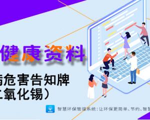 职业病危害告知牌(二氧化锡)健康危害:吸入冶炼过程中产生的氧化锡烟尘可发生金属烟热,先感全身无力、头痛、咽干、口内金属味和胸部压迫感,有时伴有恶心、呕吐、咳嗽、气促等,继而寒战和发热。长期吸入二氧化锡烟尘可引起锡肺(锡末沉着症)。可引起皮......